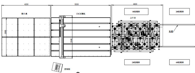 二、设备组成:XC-SP-4228型双翻双工位全自动玻璃上片台(机械式)+XC-CNC-4228型全自动玻璃切割机{双驱}+XC-QP-4228型玻璃掰片台